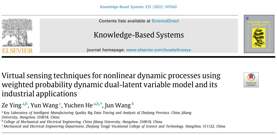 近日,中国计量大学机电工程学院何雨辰副教授团队题为“Virtual sensing techniques for nonlinear dynamic processes using weighted probability dynamic dual-latent variable model and its industrial applications”(基于质量相关加权概率动态隐变量结构的非线性动态工业过程软测量方法及其实例应用)的研究论文在人工智能顶级期刊Knowledge-Based Systems在线发表。通讯作者为何雨辰副教授,第一作者为本校研究生应泽。
