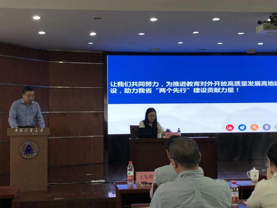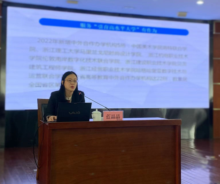 10月14日下午,学校国际化工作会议在明德楼B6会议室召开。浙江省教育厅国际处(港澳台办)处长蓝晶晶应邀出席会议并作题为《凝聚共识 踔厉奋发 建设教育对外开放高质量发展高地》的专题报告。会议由副校长俞晓平主持,各学院、部门分管外事工作领导和外事秘书以及国际处、国际教育学院全体人员参加。