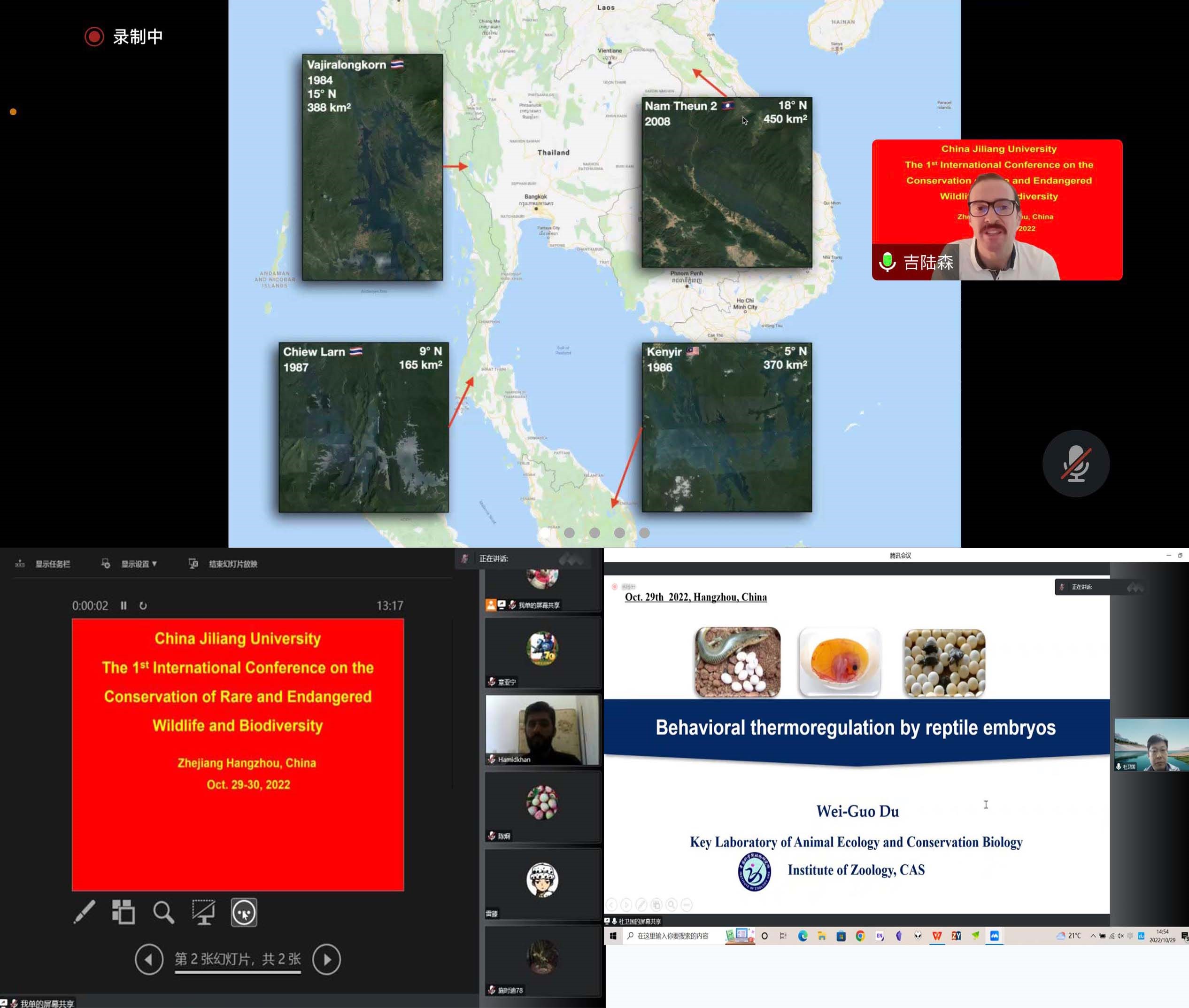 蒋志刚研究员以“Ungulates in Grasslands of China: Inventory and Conservation”为题,系统论述了中国草原有蹄类动物的编目和多样性现状,从国内外视野重点讲述我国草原有蹄类保护的威胁和挑战,并对我国未来有蹄类的保护提供了指引。杜卫国研究员从宏观到微观系统的阐述了爬行动物胚胎行为热调节的最新研究进展。Luke Gibson教授从全球视角分析了全球能源结构、发展趋势以及水力发电对生物多样性的影响,并提出了缓解措施,为绿色能源发展及其生物多样性保护指明了方向。丁平教授围绕“兴趣”、“坚持”与“合作”,为参会代表分享了40余年的科研体会。徐爱春教授分享了国际濒危野生动物华南梅花鹿与镇海棘螈的保护与研究现状。
