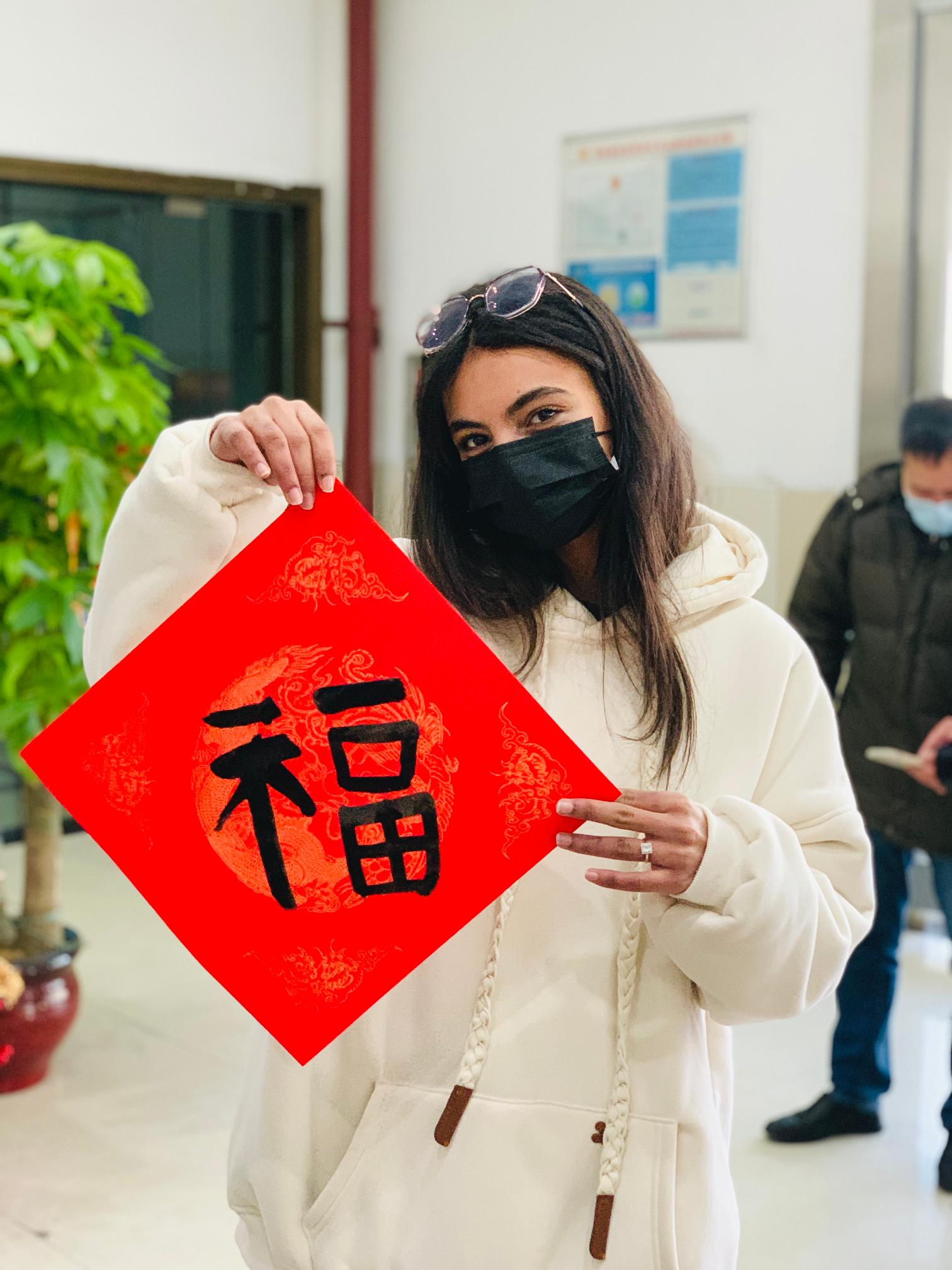 国际学生展示“福”字