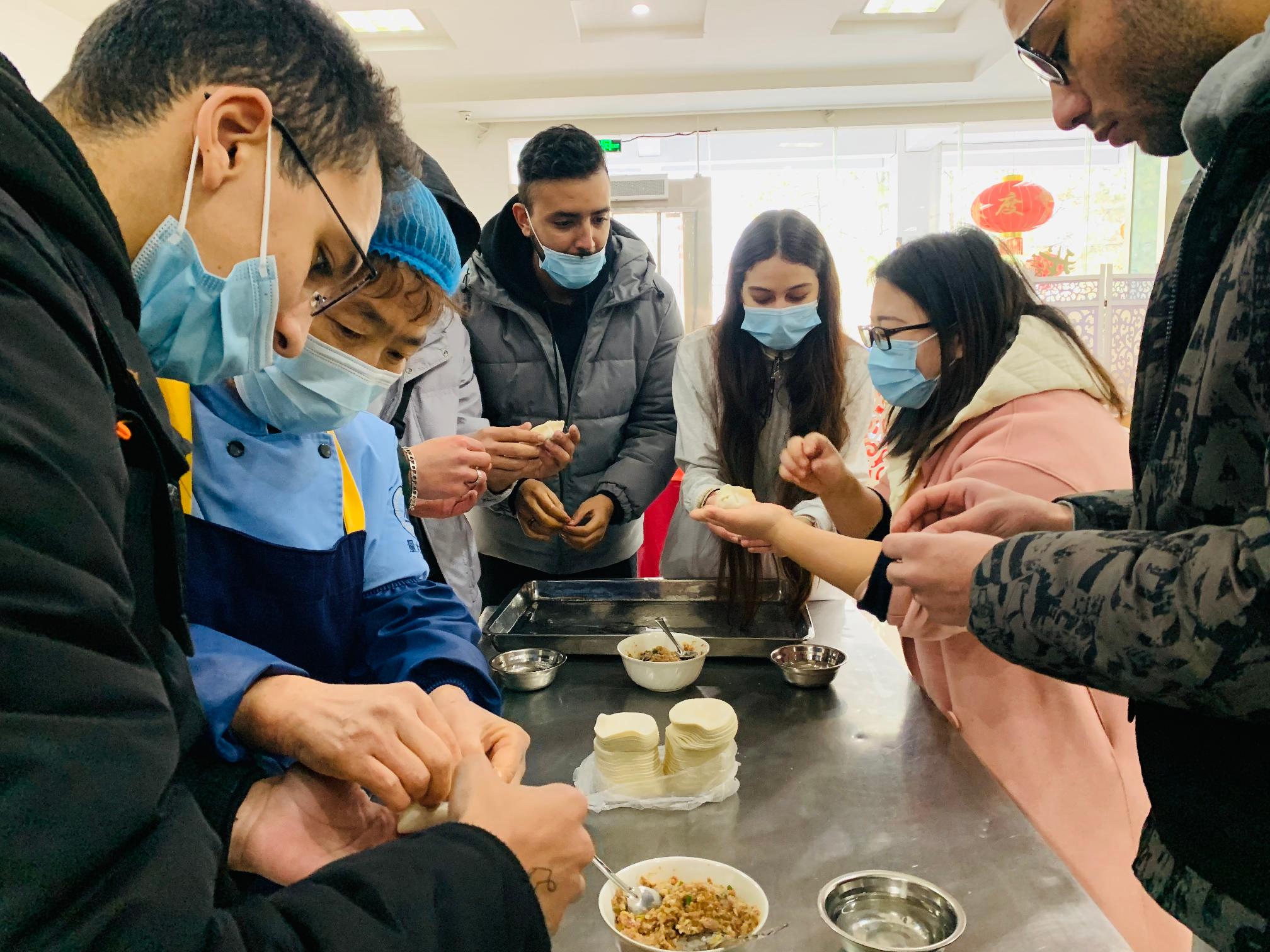 作为历史悠久的中国民间餐食,饺子同样也是年节不可缺少的一道美食。在食堂阿姨们的精心指导下,国际学生们有模有样地学起了包饺子,形态各异的饺子包住了同学们对新的美好一年的愿望。随着一大盆热气腾腾的饺子上桌,学校还为大家准备了清真简餐和水果,校领导、教师代表和中外学生们围坐在一起,一边吃一边聊。已经在中国学习生活第三个年头的20级加纳学生Joshua说:“这是我来中国后,在学校度过的第三个中国年,每年寒假是我们外国学生最’孤单’的时候,感谢学校每年寒假给我们带来不同的温暖,我也学会了在中国年的时候包饺子吃饺子,希望包住福运的饺子给我的新年带来好运。”