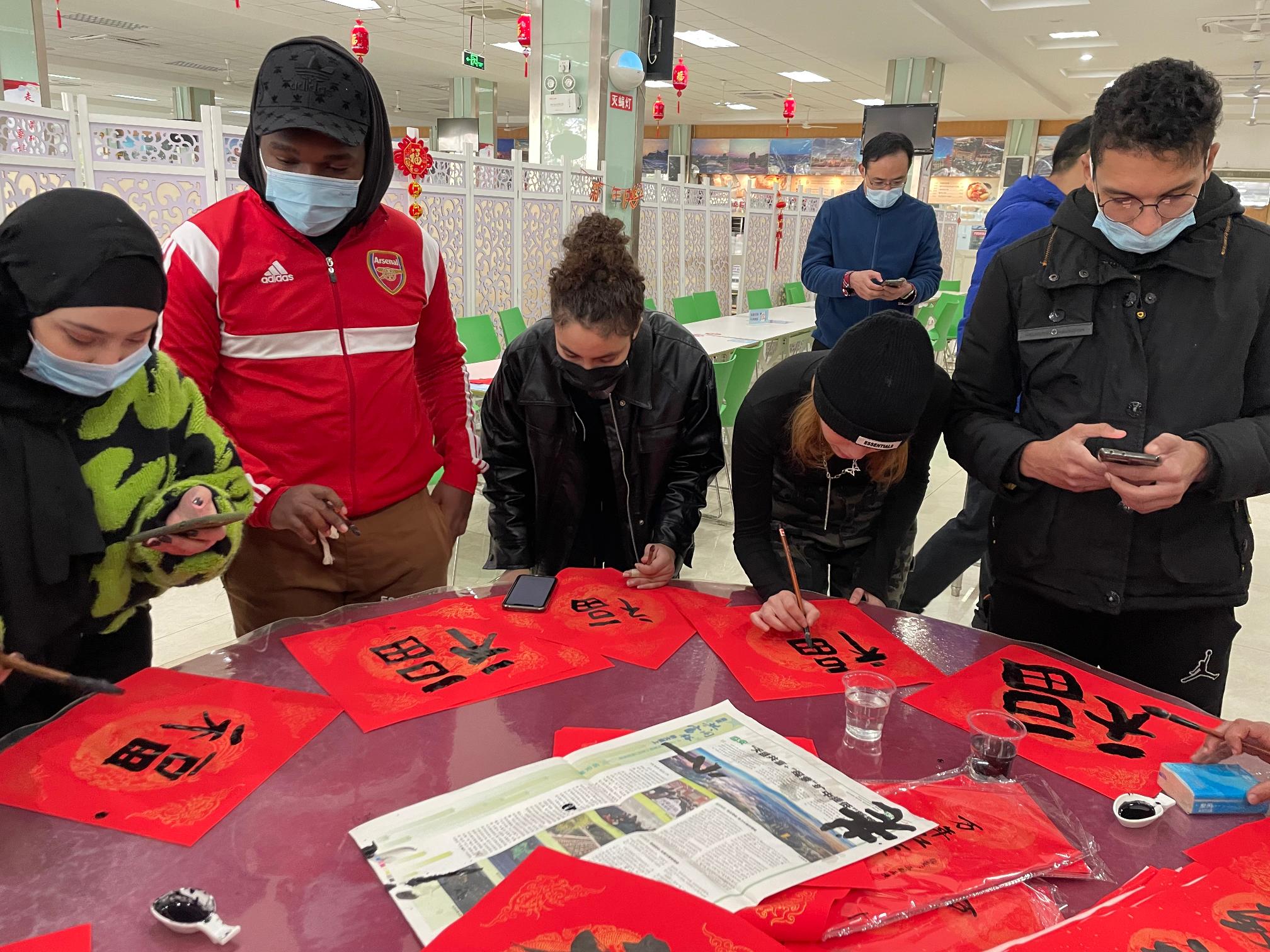 迎春接“福”。在管峰老师细心讲解“福”字和春联寓意、演示如何握笔书写后,同学们迫不及待地提笔描起“福”字。对于刚刚入境中国的国际学生来说,这是他们的初次毛笔字体验课,虽然大多写得歪歪扭扭、大大小小、长长短短,但这种别具一格的中国文化体验课还是让他们感到兴奋和亲切。因疫情一直在境外上网课,放寒假才第一次来到中国的 21级摩洛哥女生Amira Charki兴奋地拉着老师评价她写的“福”字,她说:“我太喜欢中国和中国文化了,虽然我在家里会自己对着电脑学习写中国字,但是毛笔写字是完全不一样的方式,希望’福’字能带给我更多更多的luck。”整场活动气氛融洽,笑声连连,洋溢着浓浓的“中国红”年味儿。