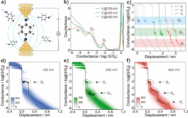 利用分子作为功能单元构筑电子元器件,有望推动未来高性能电子器件向极限尺寸演进,进而引领下一代信息技术革命。分子开关作为电路中的核心元件,能够在不同的导电状态之间进行切换。然而,大多数分子开关通常只能在“开”(1) 和“关”(0) 两种状态间切换,信息承载维度受限,已成为制约在分子水平上实现复杂逻辑运算、超高密度数据存储的瓶颈。为了构建具有原位逻辑操作、非易失性存储和信号传导协同功能的功能性分子电路,亟需开发具有多稳态、高开关比以及可精确电控能力的分子开关。这些性能指标将决定分子电子器件在可编程逻辑阵列、多维存储和功能集成化电路中的应用前景。基于此,研究团队利用扫描隧道显微镜裂结 (STM-BJ) 技术构筑了超分子电路中的电响应三态开关,突破了二元限制,实现了更丰富的逻辑编码,其完全由偏置电压控制。随外加偏压的不断增加,对苯二胺 (PPD) 分子稳定地呈现出三种清晰且稳定的状态——高电导态 (GH)、中电导态 (GM)、低电导态 (GL),开关比 (GH/GL) 高达~1250。闪烁噪声分析进一步验证了超分子结的形成;DFT计算揭示了其内在机制:外加电场不仅调控了PPD分子的偶极矩大小及取向,还显著影响了其静电势分布,分子正负电荷区域之间的势梯度明显增强,进一步强化了分子间的静电吸引。这种协同效应降低了分子聚集的能垒,驱动了稳定二聚体和三聚体结构的形成。该研究成果不仅为构建信息密度更高、能耗更低的可编程分子电路奠定了基础,也为发展分子尺度的三值逻辑器件及类脑多值存储系统提供了新的解决方案。