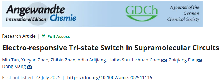 近日,中国计量大学光学与电子科技学院舒海波教授团队在国际顶级学术期刊Angewandte Chemie International Edition(中科院一区top期刊,IF=16.9)发表题为《Electro‐responsive Tri‐state Switch in Supramolecular Circuits》的研究论文,我校为第一通讯单位,光学与电子科技学院青年教师谭敏作为论文的第一作者。