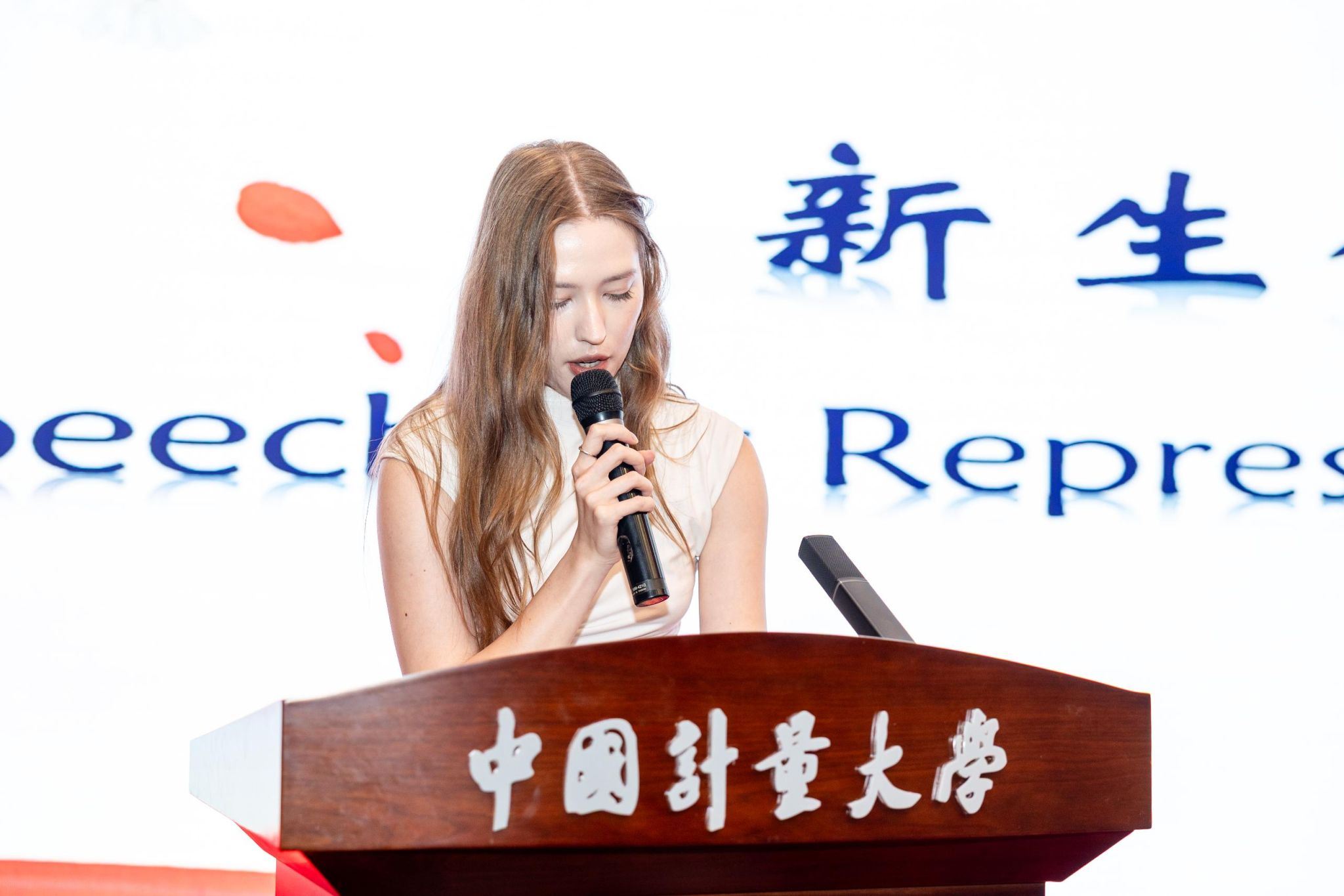 来自俄罗斯的2025级仪器科学与技术专业研究生薇姬作为新生代表发言。她首先对能有机会怀揣梦想来到这所美丽又具有多元文化的大学学习表示感谢。她提到,真正的学习不仅局限于课堂,更多在于走入大街小巷、同朋友倾听交谈,以及彼此共同探索。她表示,中文会引领大家看到不同的世界,理解不同的想法,帮助大家成为连接各国与中国的友谊桥梁。